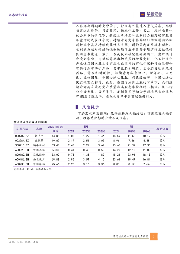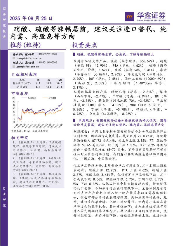 化工产品价格方面,本周部分产品有所反弹,其中本周上涨较多的有:硝酸上涨12.90%,PTA上涨4.62%,硫磺上涨3.57%,硫酸上涨3.41%等,但仍有不少产品价格下跌,其中合成氨下跌8.06%,棉短绒下跌6.76%,丁酮下跌5.78%,VCM下跌5.36%。从化工行业中报业绩表现来看,行业整体仍处于弱势,各细分子行业业绩涨跌不一。主要原因是受行业过去两年产能扩张进入新一轮产能周期以及需求偏弱影响,但也有部分子行业表现超预期,例如润滑油行业等。此外,建议重视草甘膦、化肥、进口替代、纯内需、高股息资产等方向的投资机会。具体建议如下:首先是建议重视有望进入景气周期的草甘膦行业。草甘膦行业目前经营困难,底部特征明显,库存持续下降,价格近期开始上涨,在海外进入补库存周期的大背景下,行业有可能进入景气周期,继续推荐江山股份、兴发集团、扬农化工等;第二,在行业整体机会不多的情况下,精选竞争格局和盈利能力相对较好且具备量增的成长性个股。持续看好竞争格局较好的润滑油添加剂行业中具备持续成长性且空间广阔的国内龙头瑞丰新材、盈利能力相对较好的煤制烯烃行业中具备量增逻辑且估值较低的宝丰能源;第三,在关税不确定性的影响下,出口预计会受到影响,内循环需要承担更多的增长责任,化工行业中产业链在国内且主要需求也在国内的有化学肥料行业及部分农药行业中的子产品,其中氮肥和磷肥、复合肥自给自足内循环,需求相对刚性,继续看好华鲁恒升、新洋丰、云天化、亚钾国际、中国心连心化肥、利民股份等,中国心连心化肥做重点推荐。最后,在国际油价上涨的背景下,我们继续看好具有最高资产质量和高股息率特征的三桶油。化工行业中云天化、兴发集团、龙佰集团等细分子领域龙头企业也有5%左右股息率,在红利资产中具有较强吸引力。
