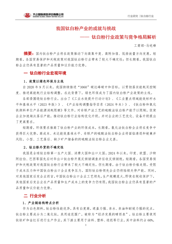 摘要:国内钛白粉产业将在政策推动下向高集中度、高附加值、低排放量方向发展。短期看,各国贸易保护和关税政策对我国钛白粉行业带来了较大不确定性;但长期看,我国钛白粉企业仍具有显著的产品质量和议价能力优势。