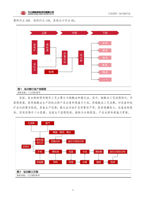 作为白色颜料,钛白粉性能优异,具有白度高,遮盖力强、亲水、亲油和耐候力强的优点。钛白粉主要成分为二氧化钛,其用途范围广,被称为“经济发展的晴雨表”。钛白粉主要使用钛铁矿和金红石进行生产作业,其下游主要用于涂料、塑料、造纸等行业,其中涂料约占60%,塑料约占20%、造纸约占14%,其他合计约占6%。