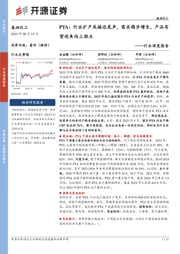 基础化工行业深度报告:PTA:行业扩产或接近尾声,需求稳步增长,产品有望迎来向上拐点