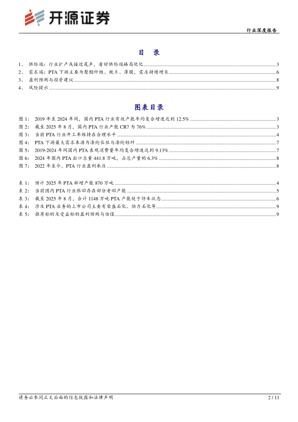 2019年至2024年间,国内PTA行业扩产进程不断加快,行业有效产能由4669万吨提升至8427.5万吨,年均复合增速达到12.5%。从PTA行业未来扩产情况来看,据百川盈孚数据,2025年国内PTA新增产能预计合计达到870万吨,其中东方盛虹、三房巷、新凤鸣分别新增250、320、300万吨。再往后看,2026年及以后规划产能仍有合计800万吨。但考虑到当前PTA盈利承压,其投产进程尚存在较大不确定性,2025年或已接近国内PTA行业扩产的尾声。同时,据卓创资讯数据,截至2025年8月,国内PTA产能中,投产超20年、15年、10年的老装置产能分别达到230、545、3315万吨,分别占总产能的2.6%、6.2%、37.4%。当前国内PTA行业依旧存在部分老旧装置,同时由于近年来PTA技术的迭代进步,老旧装置加工费或显著高于新投装置,在此背景下,部分高成本、低竞争力的老旧产能或面临出清。此外,截至2025年8月,国内PTA行业产能CR7也达到76%,集中度较高,龙头企业具备一定的定价权,同时也为行业自律与反内卷创造了良好的条件。