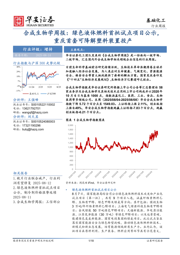 合成生物学指数是华安证券研究所根据上市公司公告等汇总整理由58家业务涉及合成生物学及其相关技术应用的上市公司构成并以2020年10月6日为基准1000点,指数涵盖化工、医药、工业、食品、生物医药等多领域公司。本周(2025/08/04-2025/08/08)华安合成生物学指数下降5.72个百分点至1549.03。上证综指上涨2.11%,创业板指上涨0.49%,华安合成生物学指数跑赢上证综指-7.83个百分点,跑赢创业板指-6.21个百分点。