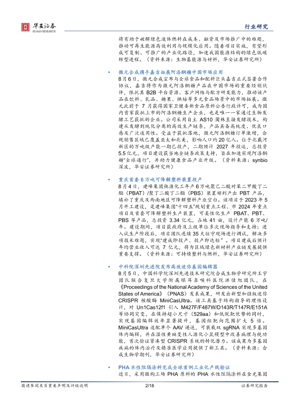 8月6日,微元合成宣布与全球食品和配料巨头嘉吉正式签署合作协议,嘉吉将作为微元阿洛酮糖产品在中国市场的重要经销伙伴,依托其B2B平台资源、客户网络与配方研发能力,推动该产品在饮料、乳品、糖果、烘焙等多元食品场景中的市场拓展。微元此前于7月获得国家卫健委新食品原料公告行政许可,成为国内首家获批上市的阿洛酮糖生产企业,也是唯一一家通过生物发酵工艺获批的企业。公司采用自主AS10菌株直接发酵技术,构建从发酵到纯化分离的高效生产链条,产品具备高纯度、优良口感及广泛适用性。受益于获批落地,微元阿洛酮糖订单激增,合规销售区域已覆盖亚太和北美,影响人口约20亿人。位于北戴河新区的万吨级产能一期已投产,二期预计2027年投运,总投资5.5亿元,项目建设获当地全链条政策支持,旨在加速实现阿洛酮糖“全球通行”,并助力健康食品产业升级。(资料来源:synbio深波,华安证券研究所)