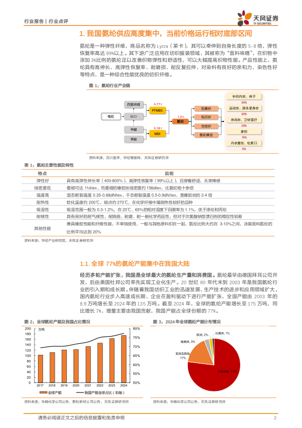 经历多轮产能扩张,我国是全球最大的氨纶生产量和消费国。伴随着我国纺织工业的迅速发展,国内氨纶行业步入高速成长期,全国产能由8.9万吨增长至2024年的135万吨。截至2024年,全球的氨纶产能增长至175万吨,同比增长7%,增量主要由我国贡献,我国产能占全球份额的77%。