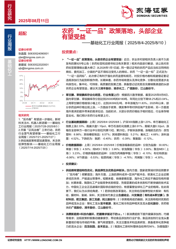基础化工行业周报:农药“一证一品”政策落地,头部企业有望受益