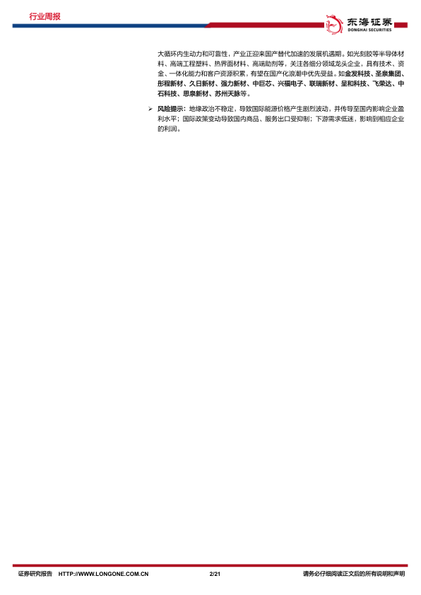 消费新趋势+科技内循环,把握需求驱动下的α。1)新消费趋势下提升健康添加剂、代糖等需求;法规政策积极推动健康食饮,带动食品添加剂行业扩容。食品添加剂行业龙头重新重视价格与市场的平衡,景气有望复苏。关注注重技术和品类研发,具备差异化竞争能力的龙头企业:百龙创园、金禾实业。2)我国化工新材料整体自给率约56%,为增强国1大循环内生动力和可靠性,产业正迎来国产替代加速的发展机遇期。如光刻胶等半导体材料、高端工程塑料、热界面材料、高端助剂等,关注各细分领域龙头企业,具有技术、资金、一体化能力和客户资源积累,有望在国产化浪潮中优先受益。如金发科技、圣泉集团、彤程新材、久日新材、强力新材、中巨芯、兴福电子、联瑞新材、呈和科技、飞荣达、中石科技、思泉新材、苏州天脉等。