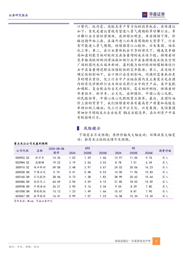 化工产品价格方面,本周部分产品有所反弹,其中本周上涨较多的有:(磷酸)五氧化二磷85%上涨9.11%,尿素上涨5.75%,电池级碳酸锂上涨4.40%,焦炭上涨4.18%等,但仍有不少产品价格下跌,其中合成氨下跌7.41%,二甲苯下跌4.61%,环氧丙烷下跌3.70%,BDO下跌3.68%。从化工行业年报业绩表现来看,行业整体仍处于弱势,各细分子行业业绩涨跌不一。主要原因是受行业过去两年产能扩张进入新一轮产能周期以及需求偏弱影响,但也有部分子行业表现超预期,例如润滑油行业等。此外,建议重视草甘膦、化肥、进口替代、纯内需、高股息资产等方向的投资机会。具体建议如下:首先是建议重视有望进入景气周期的草甘膦行业。草甘膦行业目前经营困难,底部特征明显,库存持续下降,价格近期开始上涨,在海外进入补库存周期的大背景下,行业有可能进入景气周期,继续推荐江山股份、兴发集团、扬农化工等;第二,在行业整体机会不多的情况下,精选竞争格局和盈利能力相对较好且具备量增的成长性个股。持续看好竞争格局较好的润滑油添加剂行业中具备持续成长性且空间广阔的国内龙头瑞丰新材、盈利能力相对较好的煤制烯烃行业中具备量增逻辑且估值较低的宝丰能源;第三,在关税不确定性的影响下,出口预计会受到影响,内循环需要承担更多的增长责任,化工行业中产业链在国内且主要需求也在国内的有化学肥料行业及部分农药行业中的子产品,其中氮肥和磷肥、复合肥自给自足内循环,需求相对刚性,继续看好华鲁恒升、新洋丰、云天化、亚钾国际、中国心连心化肥、利民股份等,中国心连心化肥做重点推荐。最后,在国际油价上涨的背景下,我们继续看好具有最高资产质量和高股息率特征的三桶油。化工行业中云天化、兴发集团、龙佰集团等细分子领域龙头企业也有5%左右股息率,在红利资产中具有较强吸引力。