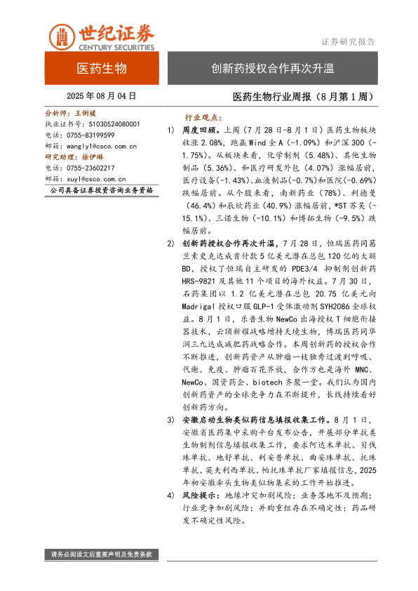 医药生物行业周报(8月第1周):创新药授权合作再次升温
