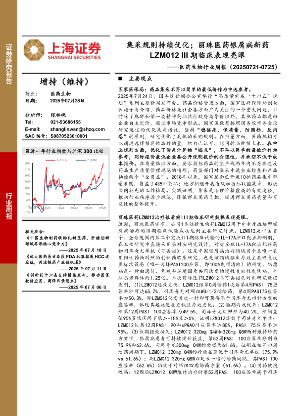 医药生物行业周报:集采规则持续优化;丽珠医药银屑病新药LZM012 III期临床表现亮眼