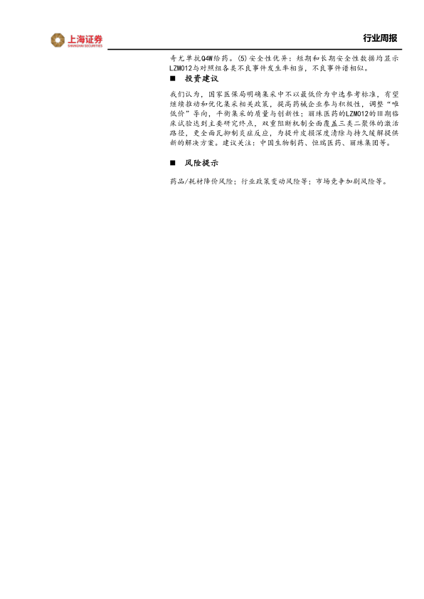 我们认为,国家医保局明确集采中不以最低价为中选参考标准,有望继续推动和优化集采相关政策,提高药械企业参与积极性,调整“唯低价”导向,平衡集采的质量与创新性;丽珠医药的LZM012的Ⅲ期临床试验达到主要研究终点,双重阻断机制全面覆盖三类二聚体的激活路径,更全面瓦抑制炎症反应,为提升皮损深度清除与持久缓解提供新的解决方案。建议关注:中国生物制药、恒瑞医药、丽珠集团等。