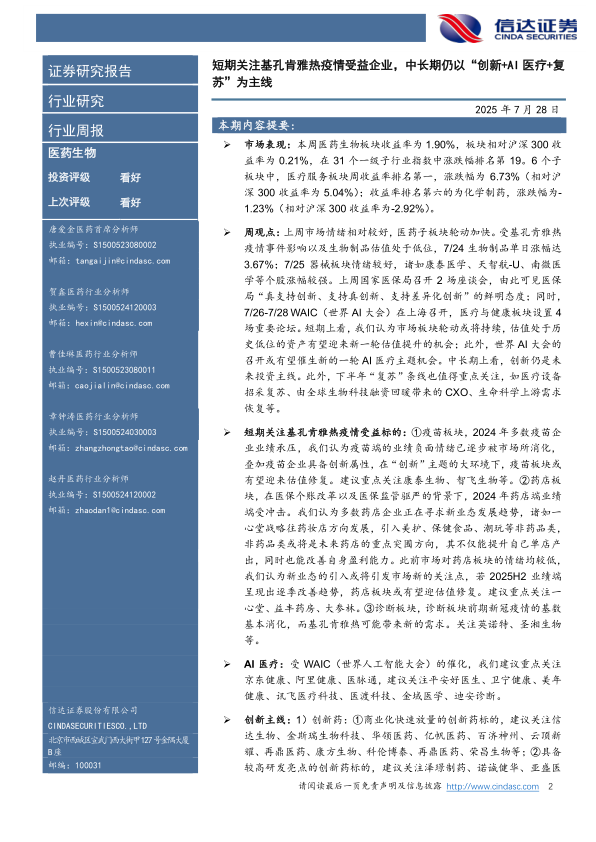 周观点:上周市场情绪相对较好,医药子板块轮动加快。受基孔肯雅热疫情事件影响以及生物制品估值处于低位,7/24生物制品单日涨幅达3.67%;7/25器械板块情绪较好,诸如康泰医学、天智航-U、南微医学等个股涨幅较强。上周国家医保局召开2场座谈会,由此可见医保局“真支持创新、支持真创新、支持差异化创新”的鲜明态度;同时,7/26-7/28WAIC(世界AI大会)在上海召开,医疗与健康板块设置4场重要论坛。短期上看,我们认为市场板块轮动或将持续,估值处于历史低位的资产有望迎来新一轮估值提升的机会;此外,世界AI大会的召开或有望催生新的一轮AI医疗主题机会。中长期上看,创新仍是未来投资主线。此外,下半年“复苏”条线也值得重点关注,如医疗设备招采复苏、由全球生物科技融资回暖带来的CXO、生命科学上游需求恢复等。