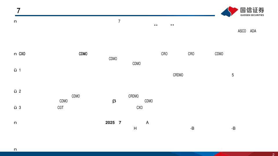 CXO行业或将迎来反转,推荐关注CDMO龙头。投融资整体呈现回暖趋势,临床前CRO业务、临床CRO业务、国内CDMO业务价格止跌回稳,随着新签订单的稳步复苏,行业或将迎来反转;国际CDMO业务方面,定价体系持续维持合理水平,疫情高基数影响已消化,从小分子、大分子、新兴业务三个维度出发,推荐关注三类海外业务占比较高的CDMO国际化龙头企业: