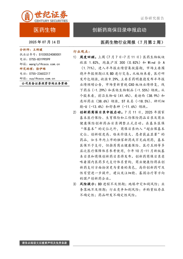 医药生物行业周报(7月第2周):创新药商保目录申报启动