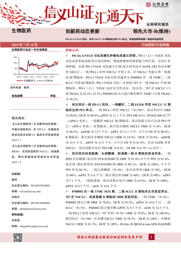 创新药动态更新:PD-1(L1)/VEGF双抗:多项NSCLC III期临床达到PFS终点,结直肠癌等肿瘤一线临床获益明显