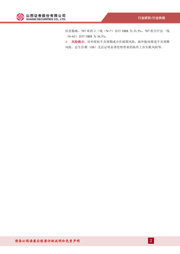 风险提示:对外授权不及预期或合作破裂风险,海外临床推进不及预期风险,总生存期(OS)无法证明显著优势带来的海外上市失败风险等。