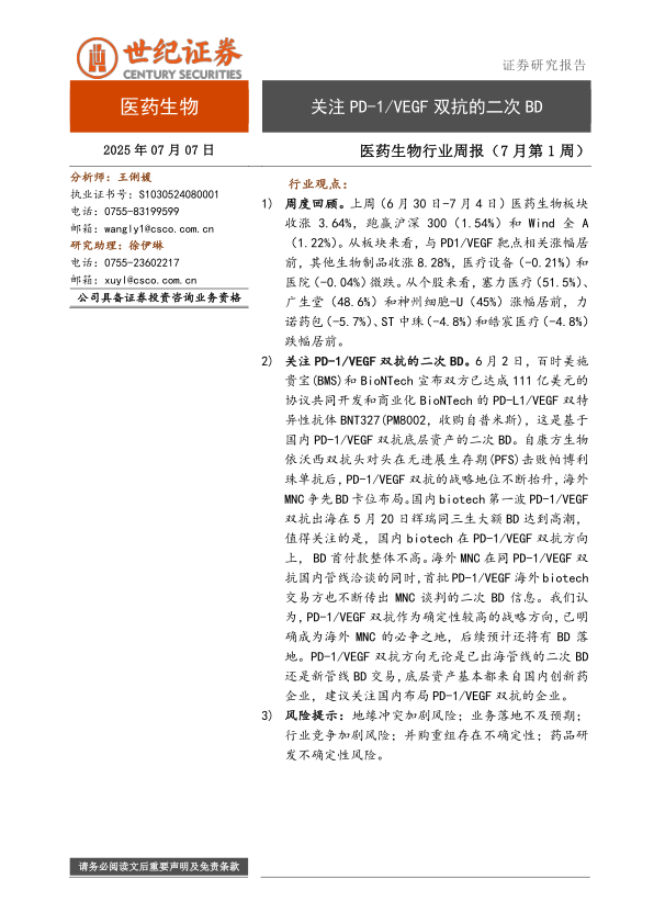 医药生物行业周报(7月第1周):关注PD-1/VEGF双抗的二次BD