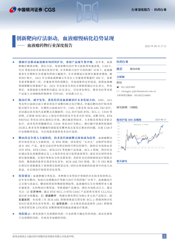 投资建议:血液肿瘤分类复杂,多种细分亚型治疗领域仍存在较多投资机会。近年来在靶向、免疫以及细胞治疗等新兴治疗手段的推广应用下,血液瘤治疗已呈现与高血压、糖尿病类似的慢病管理趋势。血液瘤的长生存周期带来大量存量患者,且药物治疗费用高,导致重磅产品频出,潜在市场机会巨大。建议关注:1)百济神州:通过BTK+BCL-2+BTK CDAC产品矩阵实现对CLL/SLL适应症全线覆盖;2)诺诚健华:构建以奥布替尼为核心多元化产品组合;3)亚盛医药:布局第三代BCR-ABL抑制剂奥雷巴替尼和BCL-2抑制剂利沙托克拉打造差异化竞争优势;4)迪哲医药:以全球首创高选择性JAK1抑制剂戈利昔替尼和LYN/BTK双靶抑制剂突破血液瘤治疗瓶颈。