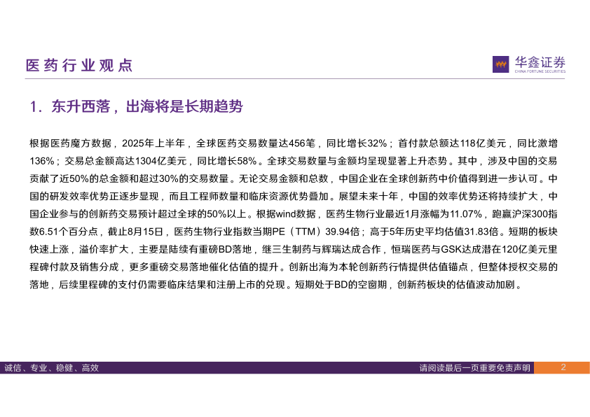 根据医药魔方数据,2025年上半年,全球医药交易数量达456笔,同比增长32%;首付款总额达118亿美元,同比激增136%;交易总金额高达1304亿美元,同比增长58%。全球交易数量与金额均呈现显著上升态势。其中,涉及中国的交易贡献了近50%的总金额和超过30%的交易数量。无论交易金额和总数,中国企业在全球创新药中价值得到进一步认可。中国的研发效率优势正逐步显现,而且工程师数量和临床资源优势叠加。展望未来十年,中国的效率优势还将持续扩大,中国企业参与的创新药交易预计超过全球的50%以上。根据wind数据,医药生物行业最近1月涨幅为11.07%,跑赢沪深300指数6.51个百分点,截止8月15日,医药生物行业指数当期PE(TTM)39.94倍;高于5年历史平均估值31.83倍。短期的板块快速上涨,溢价率扩大,主要是陆续有重磅BD落地,继三生制药与辉瑞达成合作,恒瑞医药与GSK达成潜在120亿美元里程碑付款及销售分成,更多重磅交易落地催化估值的提升。创新出海为本轮创新药行情提供估值锚点,但整体授权交易的落地,后续里程碑的支付仍需要临床结果和注册上市的兑现。短期处于BD的空窗期,创新药板块的估值波动加剧。