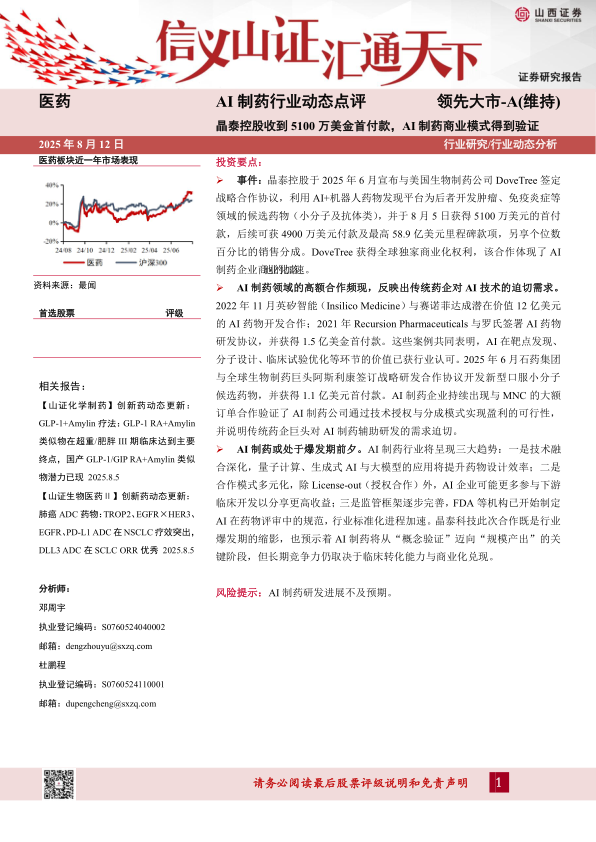 事件:晶泰控股于2025年6月宣布与美国生物制药公司DoveTree签定战略合作协议,利用AI+机器人药物发现平台为后者开发肿瘤、免疫炎症等领域的候选药物(小分子及抗体类),并于8月5日获得5100万美元的首付款,后续可获4900万美元付款及最高58.9亿美元里程碑款项,另享个位数百分比的销售分成。DoveTree获得全球独家商业化权利,该合作体现了AI制药企业商业化落地的加速。