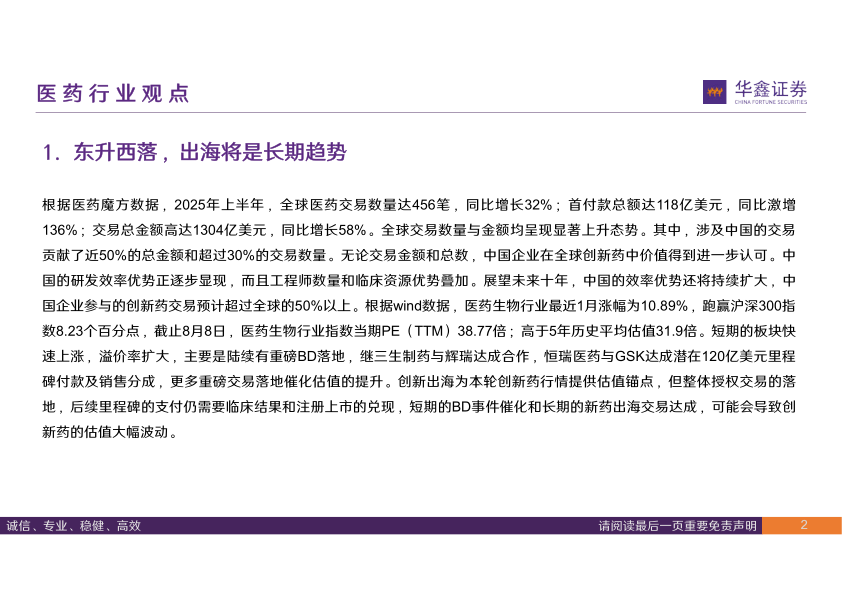 根据医药魔方数据,2025年上半年,全球医药交易数量达456笔,同比增长32%;首付款总额达118亿美元,同比激增136%;交易总金额高达1304亿美元,同比增长58%。全球交易数量与金额均呈现显著上升态势。其中,涉及中国的交易贡献了近50%的总金额和超过30%的交易数量。无论交易金额和总数,中国企业在全球创新药中价值得到进一步认可。中国的研发效率优势正逐步显现,而且工程师数量和临床资源优势叠加。展望未来十年,中国的效率优势还将持续扩大,中国企业参与的创新药交易预计超过全球的50%以上。根据wind数据,医药生物行业最近1月涨幅为10.89%,跑赢沪深300指数8.23个百分点,截止8月8日,医药生物行业指数当期PE(TTM)38.77倍;高于5年历史平均估值31.9倍。短期的板块快速上涨,溢价率扩大,主要是陆续有重磅BD落地,继三生制药与辉瑞达成合作,恒瑞医药与GSK达成潜在120亿美元里程碑付款及销售分成,更多重磅交易落地催化估值的提升。创新出海为本轮创新药行情提供估值锚点,但整体授权交易的落地,后续里程碑的支付仍需要临床结果和注册上市的兑现,短期的BD事件催化和长期的新药出海交易达成,可能会导致创新药的估值大幅波动。