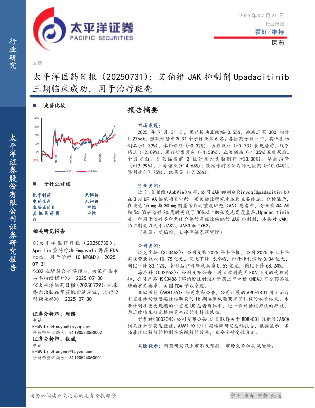 医药行业日报:艾伯维JAK抑制剂Upadacitinib三期临床成功,用于治疗斑秃