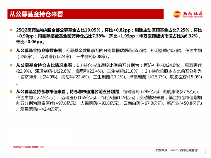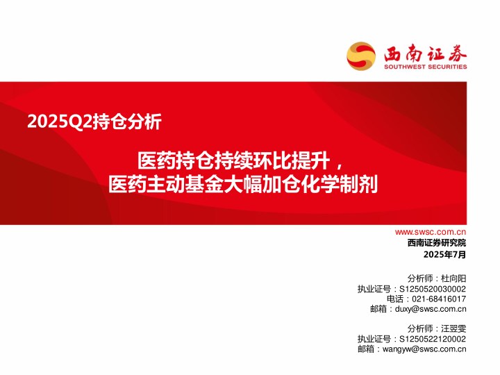 医药行业2025Q2持仓分析:医药持仓持续环比提升,医药主动基金大幅加仓化学制剂