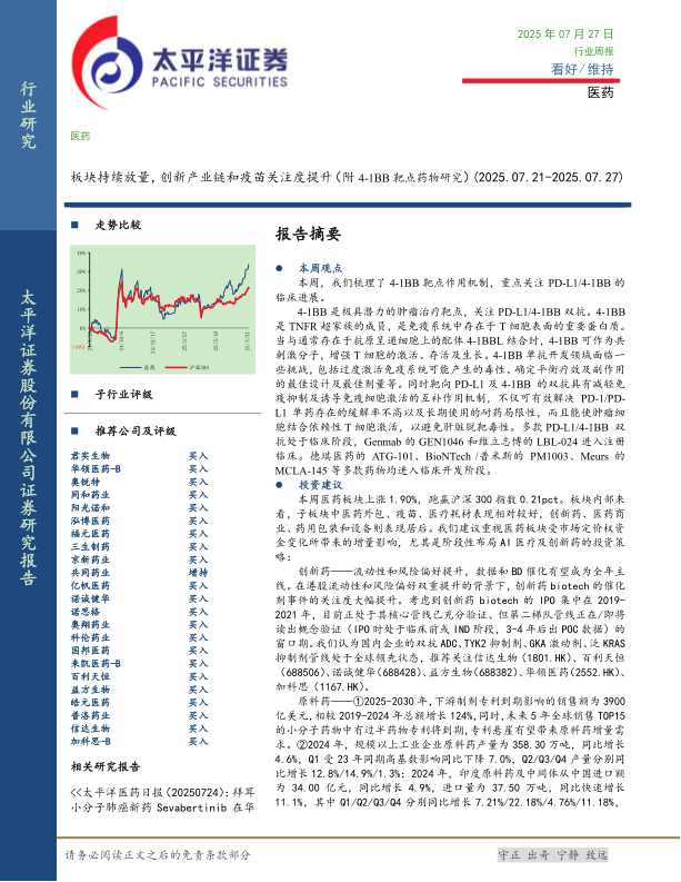 医药行业周报:板块持续放量,创新产业链和疫苗关注度提升(附4-1BB靶点药物研究)