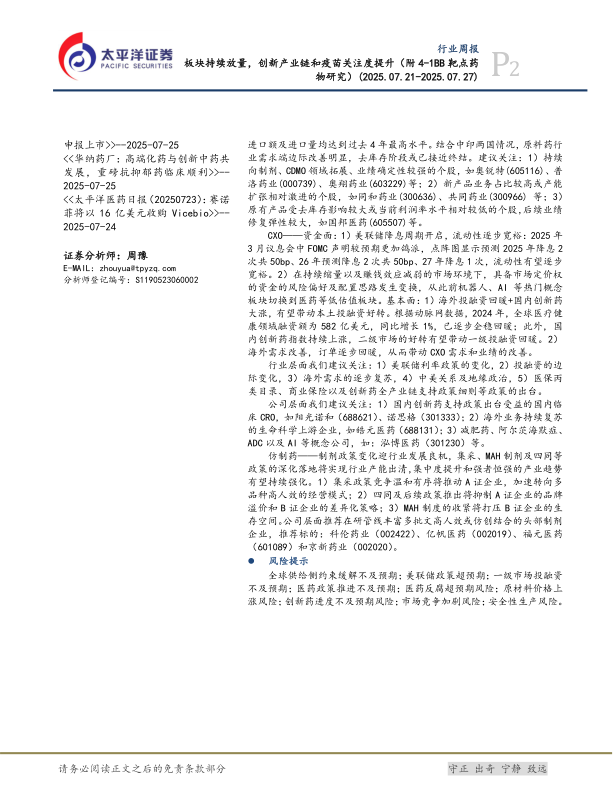原料药——①2025-2030年,下游制剂专利到期影响的销售额为3900亿美元,相较2019-2024年总额增长124%,同时,未来5年全球销售TOP15的小分子药物中有过半药物专利将到期,专利悬崖有望带来原料药增量需求。②2024年,规模以上工业企业原料药产量为358.30万吨,同比增长4.6%,Q1受23年同期高基数影响同比下降7.0%,Q2/Q3/Q4产量分别同比增长12.8%/14.9%/1.3%;2024年,印度原料药及中间体从中国进口额为34.00亿元,同比增长4.9%,进口量为37.50万吨,同比快速增长11.1%,其中Q1/Q2/Q3/Q4分别同比增长7.21%/22.18%/4.76%/11.18%,进口额及进口量均达到过去4年最高水平。结合中印两国情况,原料药行业需求端边际改善明显,去库存阶段或已接近终结。建议关注:1)持续向制剂、CDMO领域拓展、业绩确定性较强的个股,如奥锐特(605116)、普洛药业(000739)、奥翔药业(603229)等;2)新产品业务占比较高或产能扩张相对激进的个股,如同和药业(300636)、共同药业(300966)等;3)原有产品受去库存影响较大或当前利润率水平相对较低的个股,后续业绩修复弹性较大,如国邦医药(605507)等。