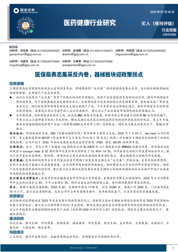医药健康行业研究:医保局表态集采反内卷,器械板块迎政策拐点