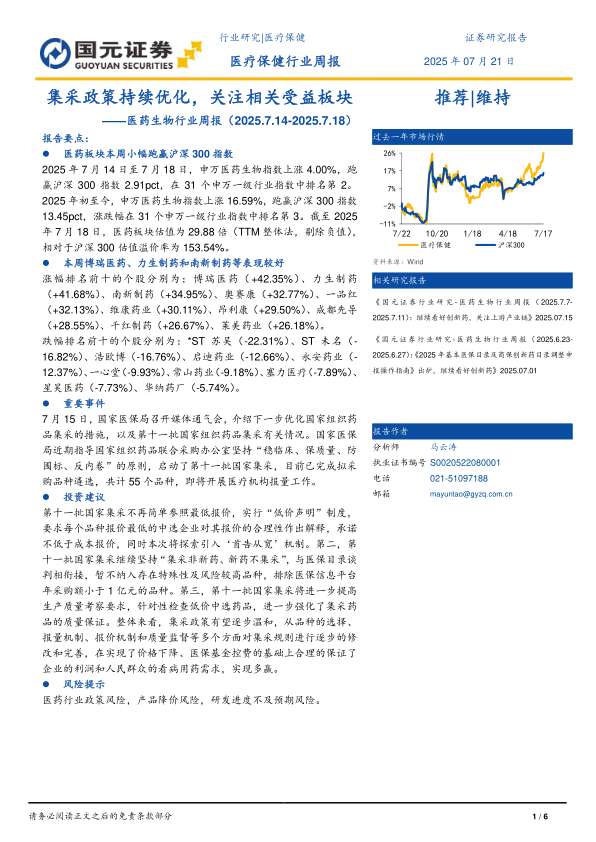 2025年7月14日至7月18日,申万医药生物指数上涨4.00%,跑赢沪深300指数2.91pct,在31个申万一级行业指数中排名第2。2025年初至今,申万医药生物指数上涨16.59%,跑赢沪深300指数13.45pct,涨跌幅在31个申万一级行业指数中排名第3。截至2025年7月18日,医药板块估值为29.88倍(TTM整体法,剔除负值),相对于沪深300估值溢价率为153.54%。