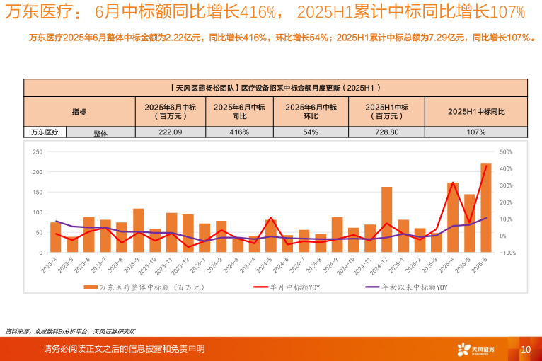 迈瑞医疗2025年6月中标总额6.23亿元,同比增长15%,其中,监护设备增速最快,同比增长28%;2025H1迈瑞医疗整体中标总额42.58亿元,整体同比增长64%;联影医疗2025年6月中标总额7.69亿元,同比增长35%,其中,磁共振增速最快,同比增长90%;2025H1联影医疗整体中标总额48.41亿元,整体同比增长53%开立医疗2025年6月中标总额1.02亿元,同比增长73%,其中,超声增速最快,同比增长76%;2025H1开立医疗整体中标总额6.42亿元,整体同比增长115%;澳华内镜2025年6月中标总额0.27亿元,同比下降46%;2025H1澳华内镜整体中标总额2.35亿元,整体同比增长57%;万东医疗2025年6月中标总额2.22亿元,同比增长416%;2025H1万东医疗整体中标总额7.29亿元,整体同比增长107%;山外山2025年6月中标总额0.30亿元,同比增长222%;2025H1山外山整体中标总额1.86亿元,整体同比增长211%。