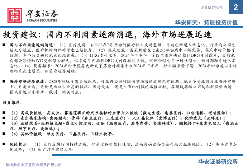 国内不利因素逐渐消退:(1)医疗反腐:自2023年7月开始的医疗行业反腐整顿,目前已经进入常态化,行业内公司已经充分适应,医疗机构的诊疗量也已经恢复。(2)集采政策:集采规则在过去2-3年实践中不断完善,集采中标价格可预期,多个品类的续采也已经完成。(3)DRG支付改革:2024年下半年,全国范围内快速推行DRG支付改革,目前来看部分领域如IVD受到影响较大,但参考早已推行DRG支付改革的区域,这部分影响为一过性影响,预计2026年进入常态化。(4)设备招采:2024年由于设备更新政策落地时间集中在2024年下半年,行业招采量下滑,2024年四季度以来终端招采高速增长,目前看趋势延续。