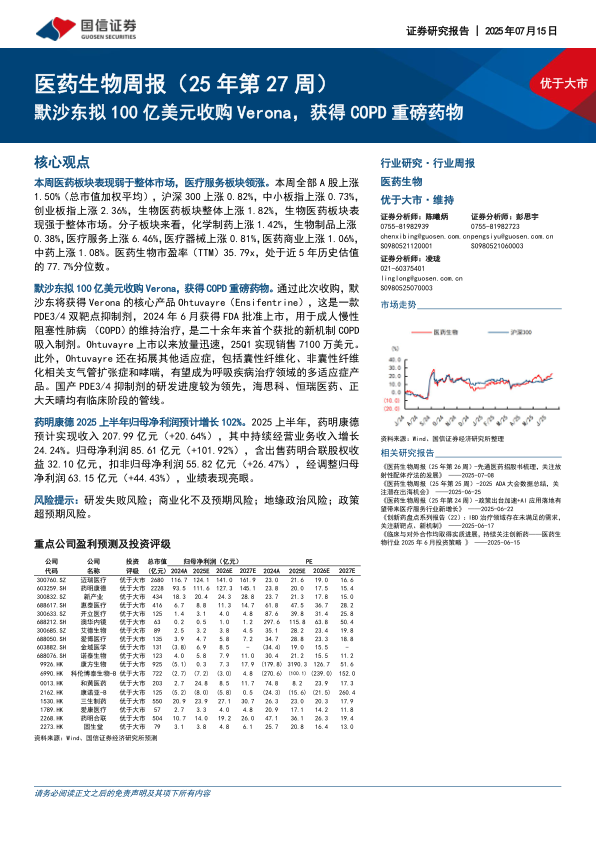医药生物周报(25年第27周):默沙东拟100亿美元收购Verona,获得COPD重磅药物