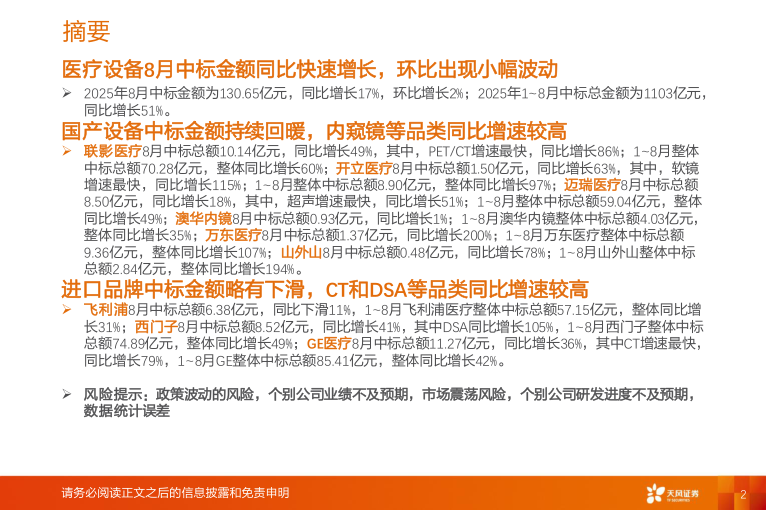 联影医疗8月中标总额10.14亿元,同比增长49%,其中,PET/CT增速最快,同比增长86%;1~8月整体中标总额70.28亿元,整体同比增长60%;开立医疗8月中标总额1.50亿元,同比增长63%,其中,软镜增速最快,同比增长115%;1~8月整体中标总额8.90亿元,整体同比增长97%;迈瑞医疗8月中标总额8.50亿元,同比增长18%,其中,超声增速最快,同比增长51%;1~8月整体中标总额59.04亿元,整体同比增长49%;澳华内镜8月中标总额0.93亿元,同比增长1%;1~8月澳华内镜整体中标总额4.03亿元,整体同比增长35%;万东医疗8月中标总额1.37亿元,同比增长200%;1~8月万东医疗整体中标总额9.36亿元,整体同比增长107%;山外山8月中标总额0.48亿元,同比增长78%;1~8月山外山整体中标总额2.84亿元,整体同比增长194%。