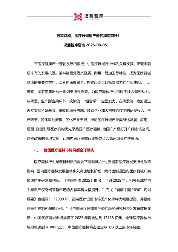 医疗器械行业是塑料制品的重要下游领域之一,受国家医疗器械支持性政策影响,国内医疗器械发展整体步入高速增长阶段,同时也倒逼国内医疗器械厂商加速自主研发和创新。《中国制造2025》提出:“到2025年,相关领域的自主知识产权高端装备市场的占有率将大幅提升。”而《“健康中国2030”规划纲要》也强调:“2030年,高端医疗设备市场国产化率将大幅度提高,并最终跻身世界制药强国行列。”《中国医疗器械国产替代趋势研究报告》发布数据显示,中国医疗器械市场规模在2025年将会达到17168亿元,全球医疗器械市场规模达到41885亿元,中国医疗器械将占据全球1/3以上的市场份额。