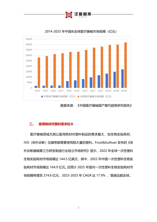 医疗器械领域尤其以医用耗材对塑料制品的需求最大,如生物实验耗材、IVD(体外诊断)仪器等都需要使用到大量的塑料。Frost&Sullivan发布的《体外诊断器械第三方研发制造行业独立市场研究》显示,2022年全球一次性塑料生物实验耗材市场规模达144.5亿美元,其中,2022年中国一次性塑料生物实验耗材市场规模达164.9亿元。且预计2025年国内一次性塑料生物实验耗材市场规模将增至274.6亿元,2023-2025年CAGR达17.9%,增速远超全球。