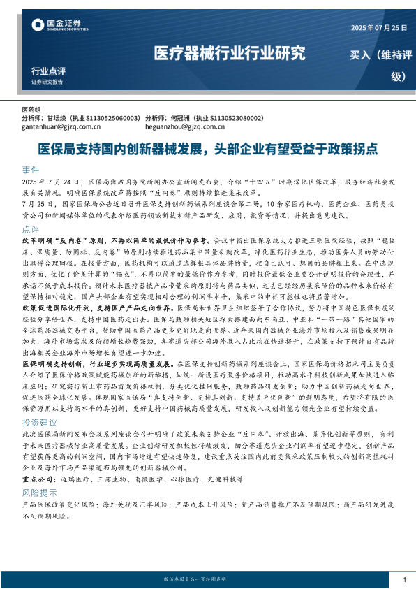 此次医保局新闻发布会及系列座谈会召开明确了政策未来支持企业“反内卷”、开放出海、差异化创新等原则,有利于未来医疗器械行业高质量发展。企业创新研发积极性将被激发,细分赛道龙头企业利润率有望逐步稳定,创新产品有望获得更高的利润空间,国内市场增速有望快速修复,建议重点关注国内此前受集采政策压制较大的创新高值耗材企业及海外市场产品渠道布局领先的创新器械公司。