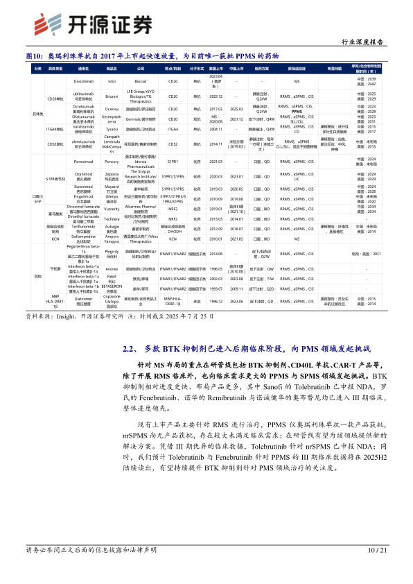 (1)PPMS:仅奥瑞利珠单抗一款产品获批上市,Tolebrutinib与Fenebrutinib预计在2025H2读出III期主要临床终点数据;BTK抑制剂在PPMS领域尚未实现概念验证,数据读出后有望快速提升BTK抑制剂在PMS领域的价值。