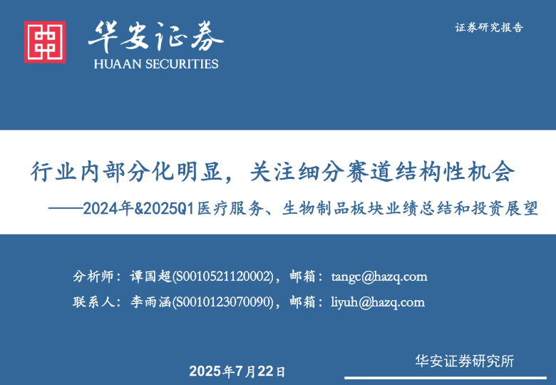 2024年&2025Q1医疗服务、生物制品板块业绩总结和投资展望:行业内部分化明显,关注细分赛道结构性机会