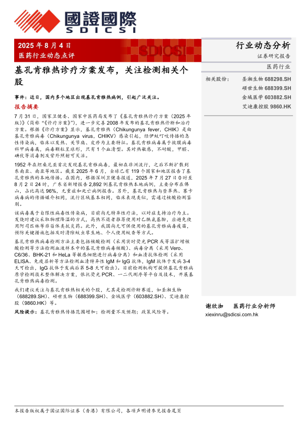 风险提示:基孔肯雅热传播范围增加;检测量不及预期;政策风险等。