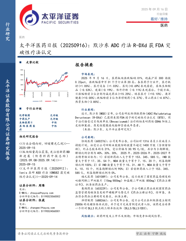 2025年9月16日,医药板块涨跌幅+0.01%,跑赢沪深300指数0.22pct,涨跌幅居申万31个子行业第20名。各医药子行业中,医疗耗材(+1.05%)、医疗设备(+1.03%)、医院(+0.69%)表现居前,其他生物制品(-0.53%)、疫苗(-0.19%)、体外诊断(-0.11%)表现居后。个股方面,日涨幅榜前3位分别为诚达药业(+15.25%)、皓辰医疗(+10.10%)、澳洋健康(+10.00%);跌幅榜前3位为泽璟制药(-5.37%)、常山药业(-4.87%)、热景生物(-3.85%)。