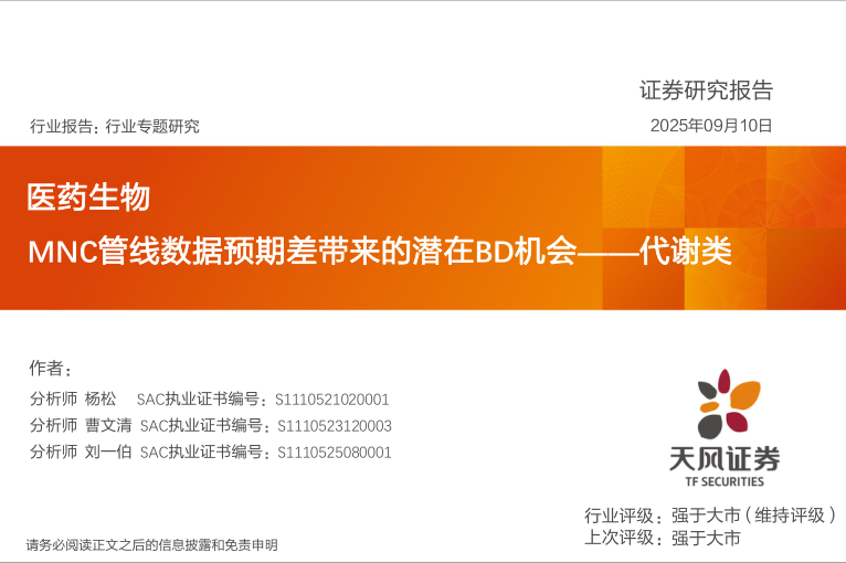 医药生物行业专题研究:MNC管线数据预期差带来的潜在BD机会——代谢类