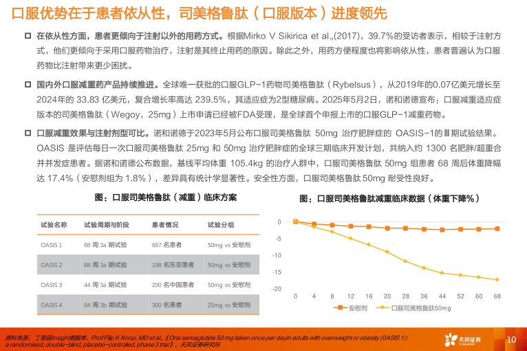 (2)口服给药方式的进化有望加速减重市场增长,主流在研管线可分为小分子&多肽:目前已上市减重适应症的GLP-1产品给药方式均为注射,在依从性方面,患者更倾向于注射以外的用药方式。全球唯一获批的口服GLP-1药物司美格鲁肽(Rybelsus)适应症为2型糖尿病。2025年5月2日,诺和诺德宣布:口服减重适应症版本的司美格鲁肽(Wegoy,25mg)上市申请已经被FDA受理,是全球首个申报上市的口服多肽类GLP-1减重药物。从在研管线看,小分子、多肽是主流药物类型,其中小分子管线数量多,但尚无已上市品种。