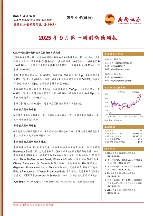2025年9月第一周,陆港两地创新药板块共计81个股上涨,27个股下跌。其中涨幅前三为三叶草生物-B(+98.84%)、圣诺医药-B(+62.01%)、创胜集团-B(+47.26%)。跌幅前三为前沿生物-U(-23.98%)、海特生物(-12.25%)、舒泰神(-10.47%)。