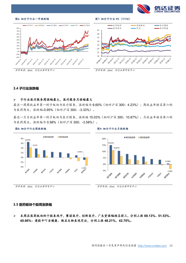 市场表现:本周医药生物板块收益率为3.08%,板块相对沪深300收益率为+0.70%,在31个一级子行业指数中涨跌幅排名第10。6个子板块中,医疗服务板块周涨幅最大,涨幅6.97%(相对沪深300收益率为+4.23%);跌幅最大的为医药商业,跌幅为0.95%(相对沪深300收益率为-3.33%)。