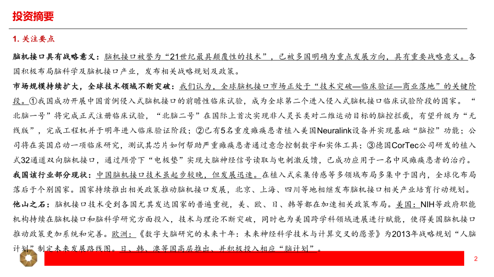 市场规模持续扩大,全球技术领域不断突破:我们认为,全球脑机接口市场正处于“技术突破—临床验证—商业落地”的关键阶段。①我国成功开展中国首例侵入式脑机接口的前瞻性临床试验,成为全球第二个进入侵入式脑机接口临床试验阶段的国家。“北脑一号”将完成正式注册临床试验,“北脑二号”在国际上首次实现非人灵长类对二维运动目标的脑控拦截,有望升级为“无线版”,完成工程机并于明年进入临床验证阶段;②已有5名重度瘫痪患者植入美国Neuralink设备并实现基础“脑控”功能;公司将在英国启动一项临床研究,测试其芯片如何帮助严重瘫痪患者通过意念控制数字和实体工具;③德国CorTec公司研发的植入式32通道双向脑机接口,通过颅骨下“电极垫”实现大脑神经信号读取与电刺激反馈,已成功应用于一名中风瘫痪患者的治疗。
