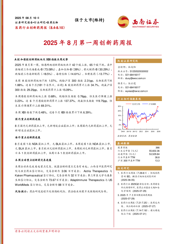 2025年8月第一周,陆港两地创新药板块共计42个股上涨,65个股下跌。其中涨幅前三为北海康成-B(73.08%)、嘉和生物-B(39%)、歌礼制药-B(30.29%)。跌幅前三为南新制药(-18.5%)、海特生物(-14.61%)、和黄医药(-13.77%)。