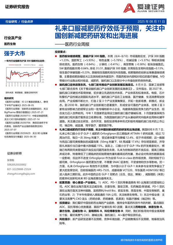 礼来口服减肥药疗效低于预期,关注中国创新减肥药的研发和出海进展。美国时间8月7日,礼来公布口服小分子GLP-1减肥药Orforglipron的三期临床ATTAIN-1研究结果,经过72周治疗后,每日一次36mg剂量下,受试者体重平均降幅12.4%,低于市场预期;这一数据与竞品口服司美格鲁肽的减重效果(50mg剂量下,68周减重17.4%)存在明显差距,并导致礼来股价当日盘中最大跌幅超15%。实际上,口服小分子GLP-1Ra的开发难度较大,辉瑞已有两款同类管线因不良反应问题而宣告失败,礼来为控制该药的不良反应、提高三期临床成功率,特意降低了三期临床的初始爬坡剂量和最高给药剂量,势必会对有效性数据造成一定影响;但这并不改变Orforglipron作为全球First-in-class的市场优势,同时相较于口服司美,Orforglipron服药更加方便,不需要SNAC促渗剂,不受食物和饮水等影响。另一方面,礼来Orforglipron有效性不及预期,为中国小分子GLP-1未来参与全球竞争留出了更大的发挥空间,目前恒瑞医药HRS-7535、成都闻泰VCT220、华东医药HDM1002等已进入临床三期阶段。此外中国药企在GLP-1双靶点(众生、信达、博瑞)、减脂增肌(来凯)的差异化创新和未来BD出海进展也值得关注。