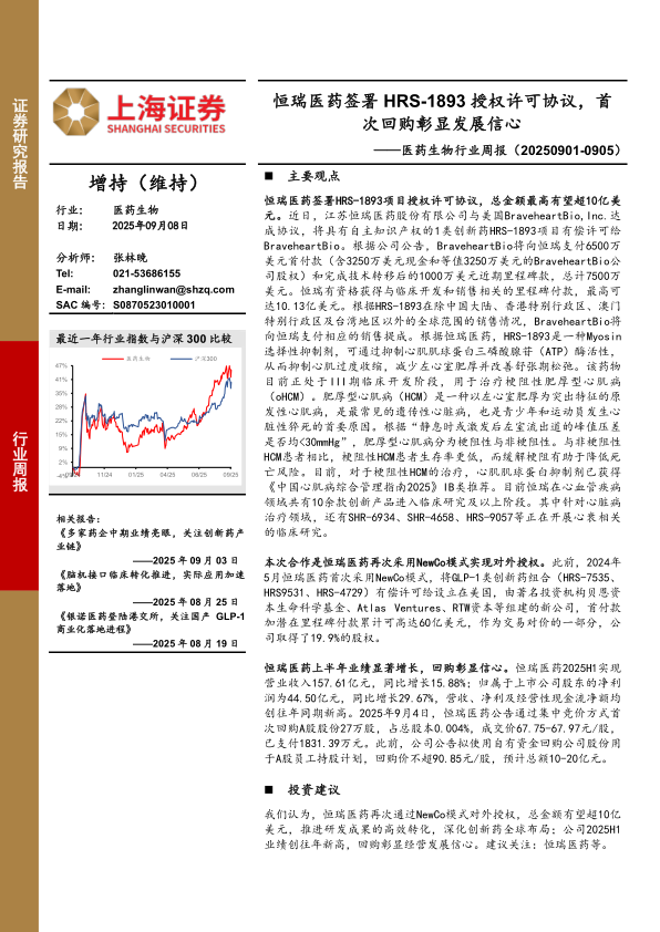 恒瑞医药签署HRS-1893项目授权许可协议,总金额最高有望超10亿美元。近日,江苏恒瑞医药股份有限公司与美国BraveheartBio,Inc.达成协议,将具有自主知识产权的1类创新药HRS-1893项目有偿许可给BraveheartBio。根据公司公告,BraveheartBio将向恒瑞支付6500万美元首付款(含3250万美元现金和等值3250万美元的BraveheartBio公司股权)和完成技术转移后的1000万美元近期里程碑款,总计7500万美元。恒瑞有资格获得与临床开发和销售相关的里程碑付款,最高可达10.13亿美元。根据HRS-1893在除中国大陆、香港特别行政区、澳门特别行政区及台湾地区以外的全球范围的销售情况,BraveheartBio将向恒瑞支付相应的销售提成。根据恒瑞医药,HRS-1893是一种Myosin选择性抑制剂,可通过抑制心肌肌球蛋白三磷酸腺苷(ATP)酶活性,从而抑制心肌过度收缩,减少左心室肥厚并改善舒张期松弛。该药物目前正处于III期临床开发阶段,用于治疗梗阻性肥厚型心肌病(oHCM)。肥厚型心肌病(HCM)是一种以左心室肥厚为突出特征的原发性心肌病,是最常见的遗传性心脏病,也是青少年和运动员发生心脏性猝死的首要原因。根据“静息时或激发后左室流出道的峰值压差是否均<30mmHg”,肥厚型心肌病分为梗阻性与非梗阻性。与非梗阻性HCM患者相比,梗阻性HCM患者生存率更低,而缓解梗阻有助于降低死亡风险。目前,对于梗阻性HCM的治疗,心肌肌球蛋白抑制剂已获得《中国心肌病综合管理指南2025》IB类推荐。目前恒瑞在心血管疾病领域共有10余款创新产品进入临床研究及以上阶段。其中针对心脏病治疗领域,还有SHR-6934、SHR-4658、HRS-9057等正在开展心衰相关的临床研究。