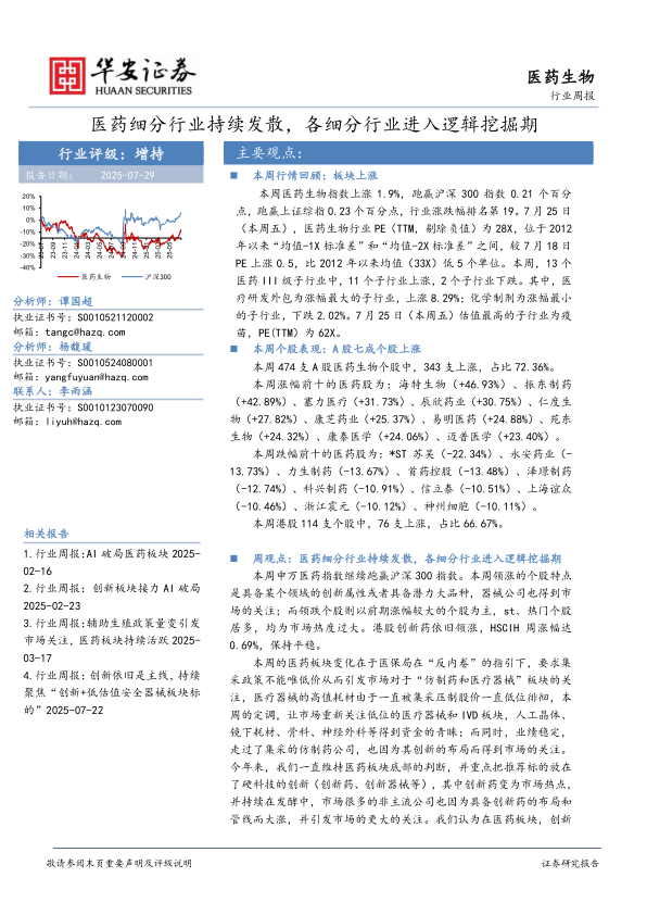 医药生物行业周报:医药细分行业持续发散,各细分行业进入逻辑挖掘期